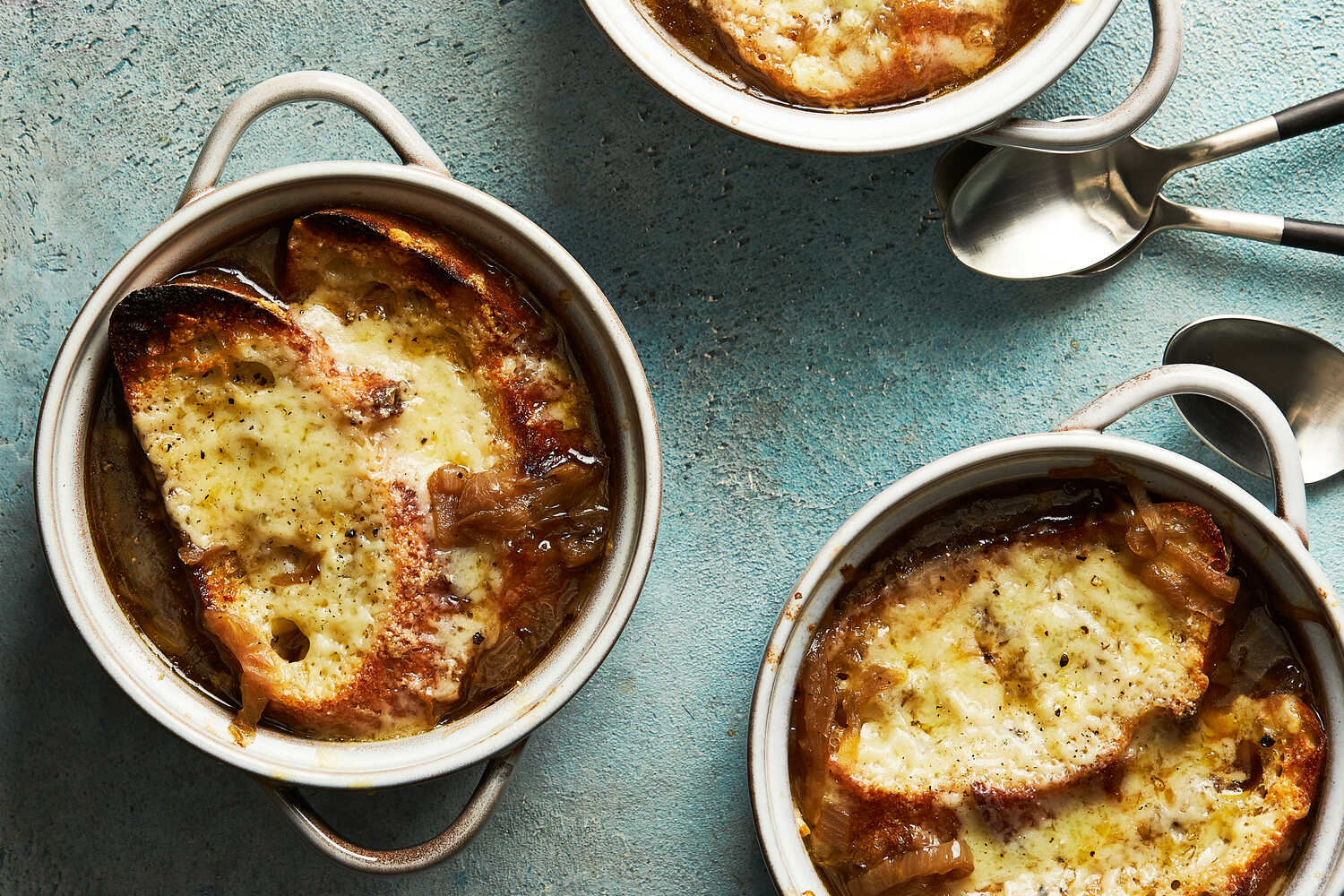 این سوپ معروف به پیازها و سسهای قهوهایاش معروف است. روی آن با پنیر گراتینه شده تزیین میشود.